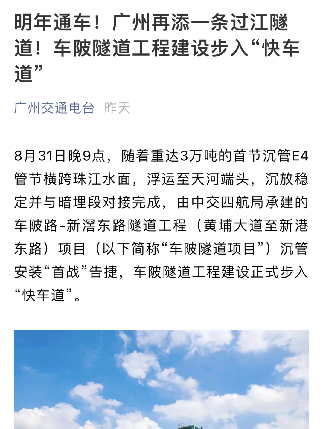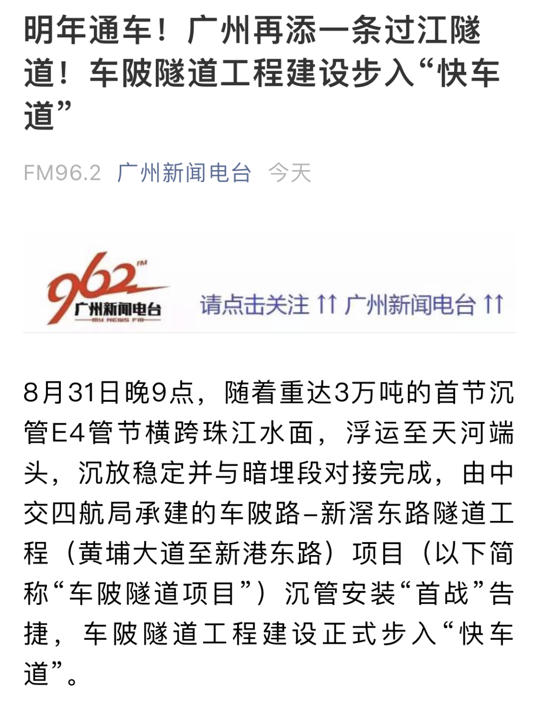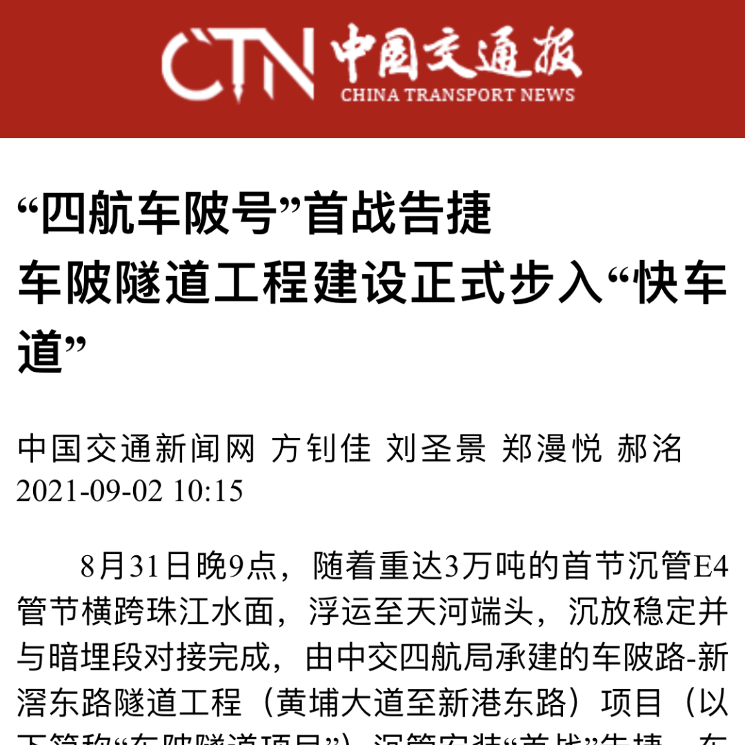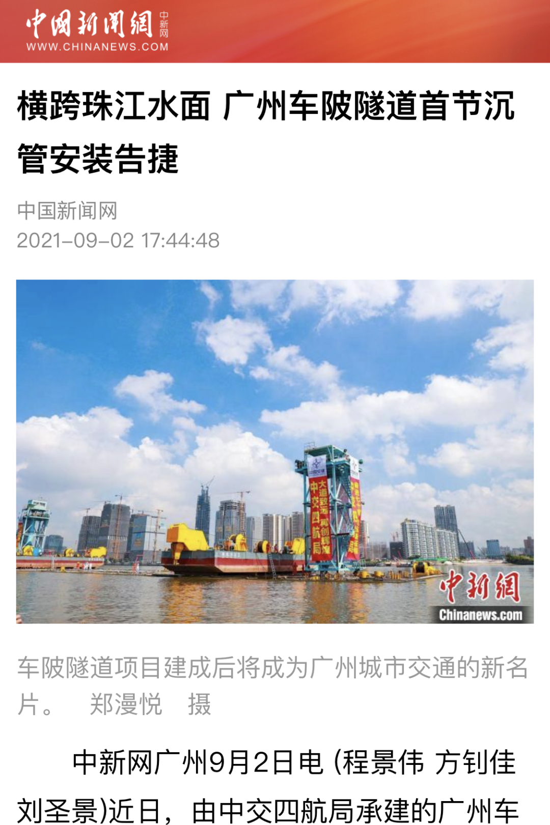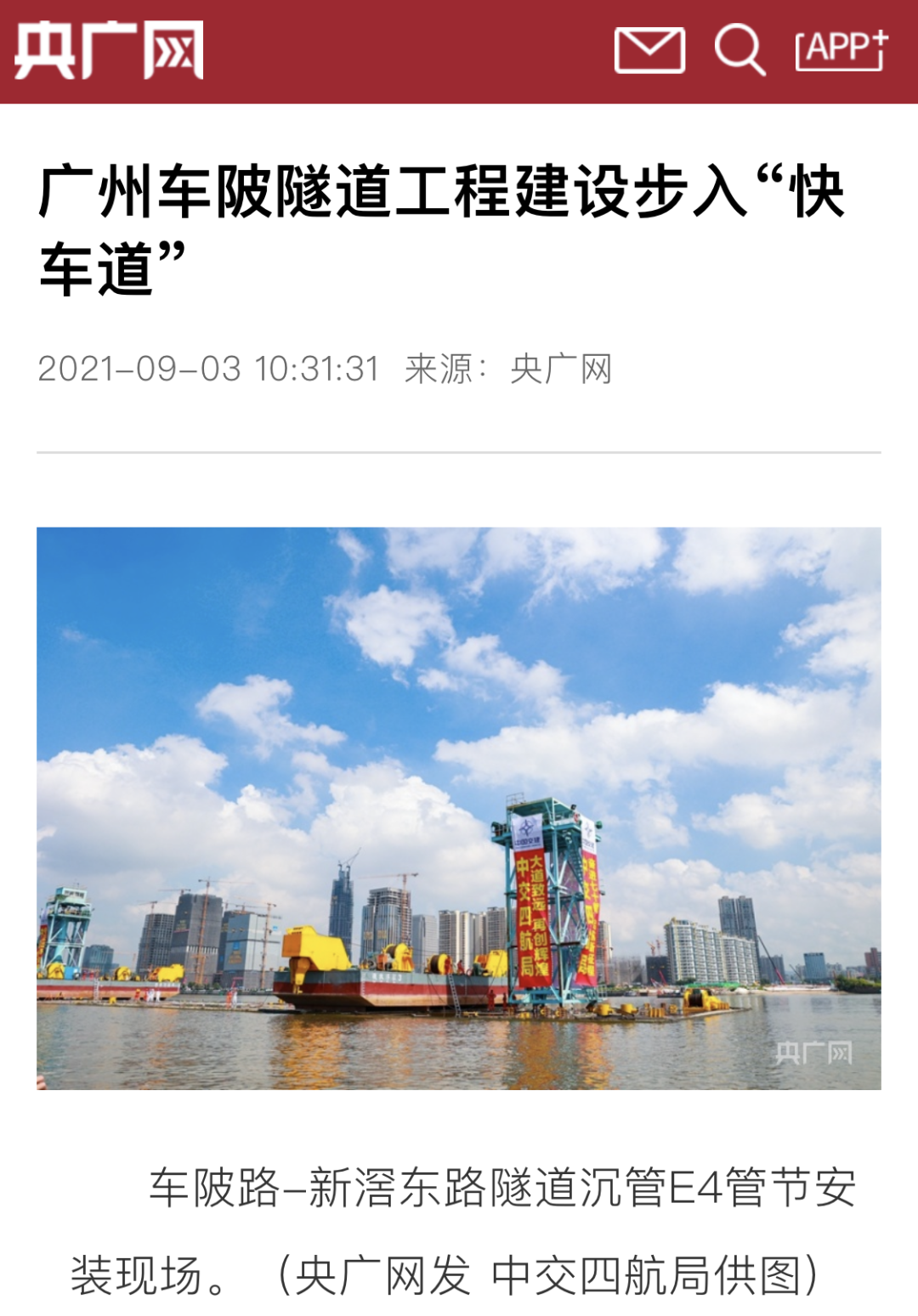 2021年8月31日,车陂隧道项目首节沉管E4管节安装成功,标志着项目工程建设进入加速阶段。人民网、新华网、中国新闻网、南方日报等近60家媒体对此进行了关注报道,项目建设受到各界好评。