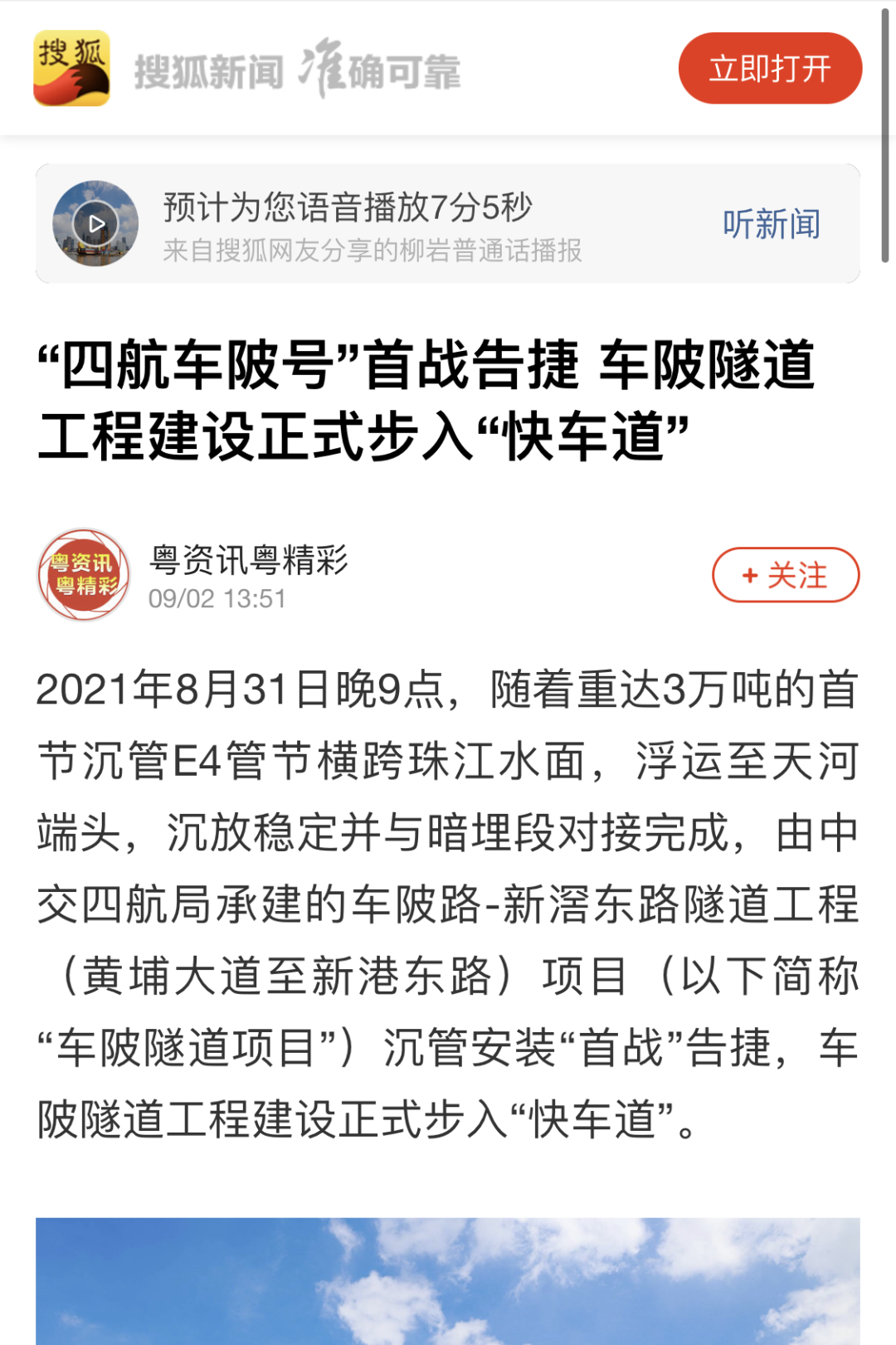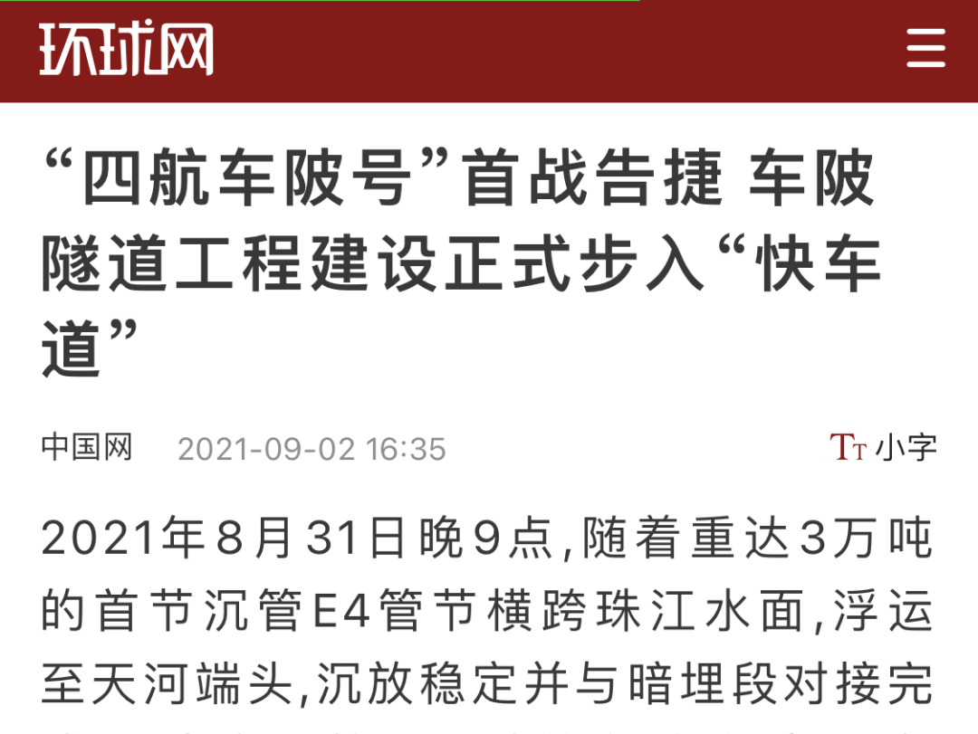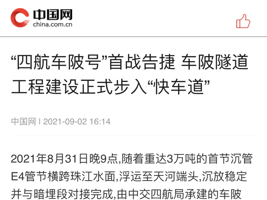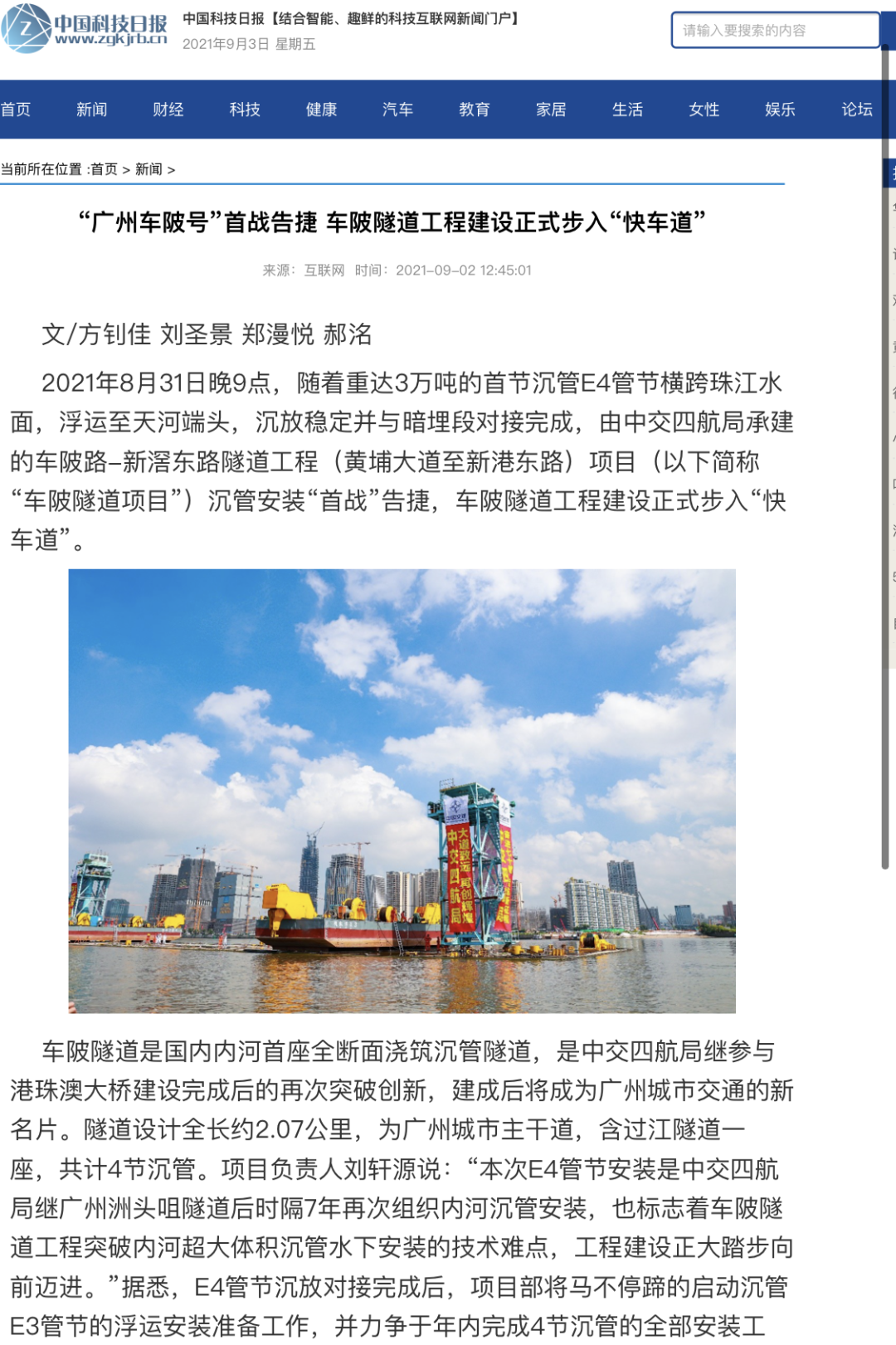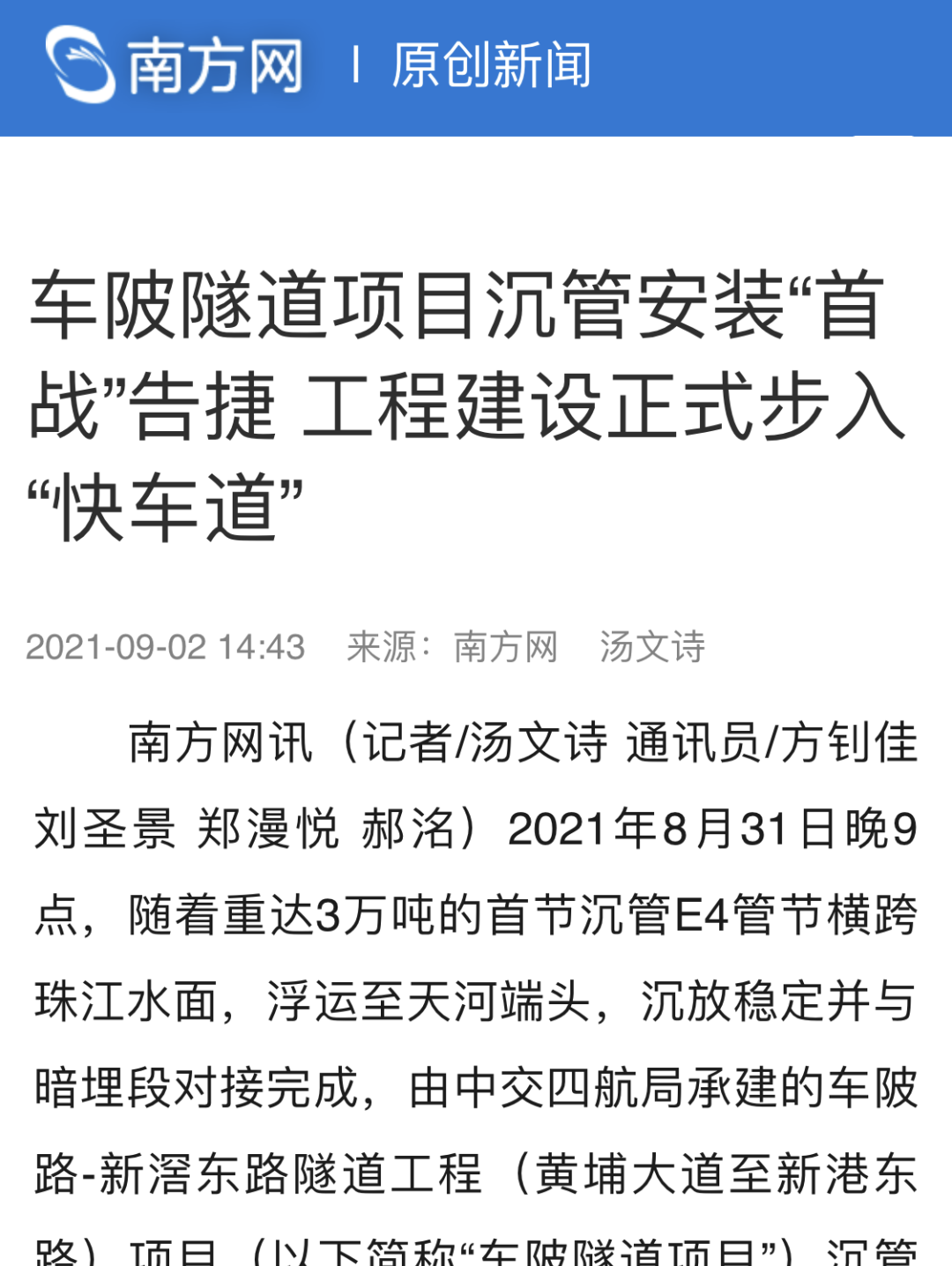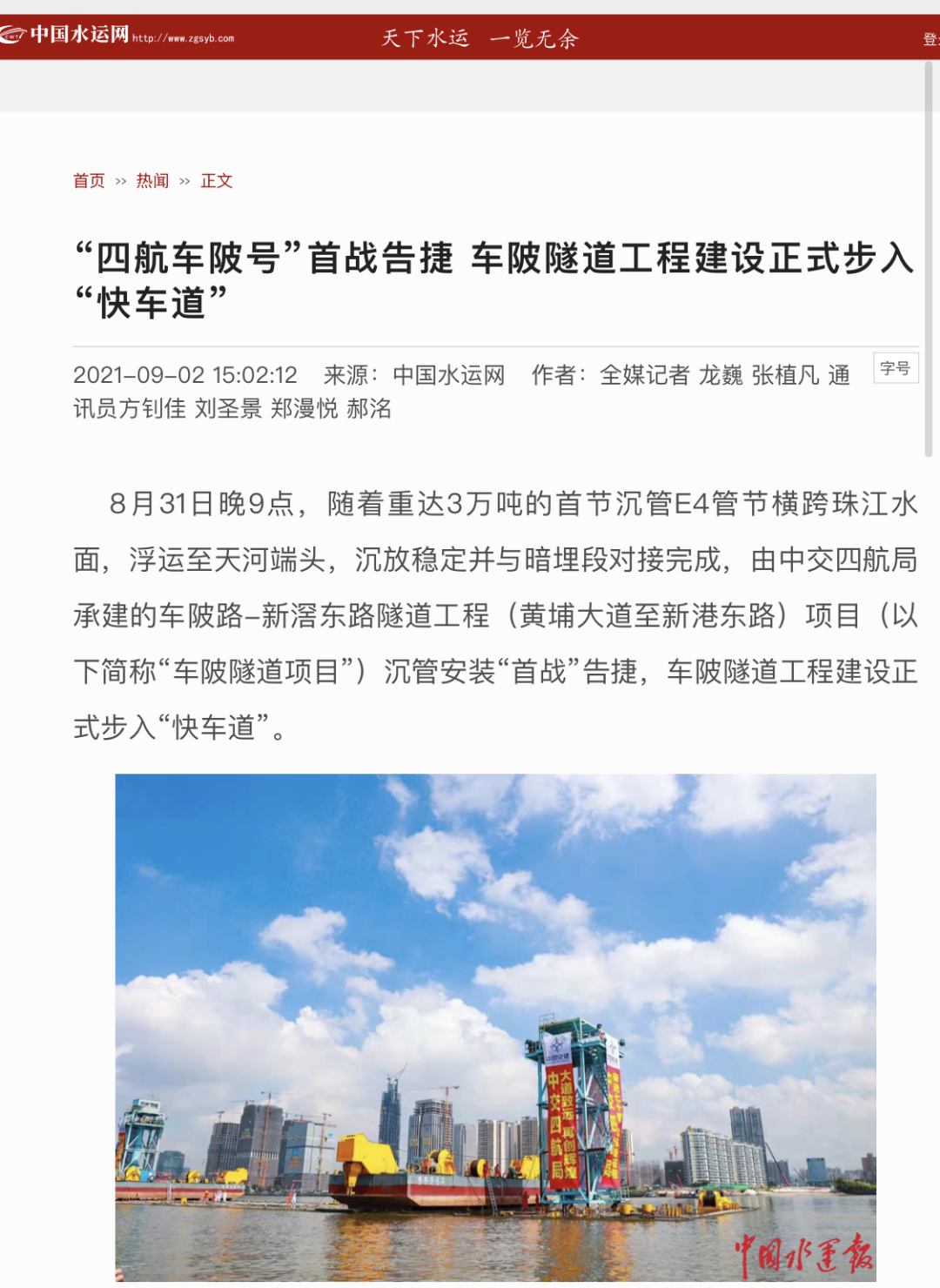 2021年8月31日,车陂隧道项目首节沉管E4管节安装成功,标志着项目工程建设进入加速阶段。人民网、新华网、中国新闻网、南方日报等近60家媒体对此进行了关注报道,项目建设受到各界好评。
