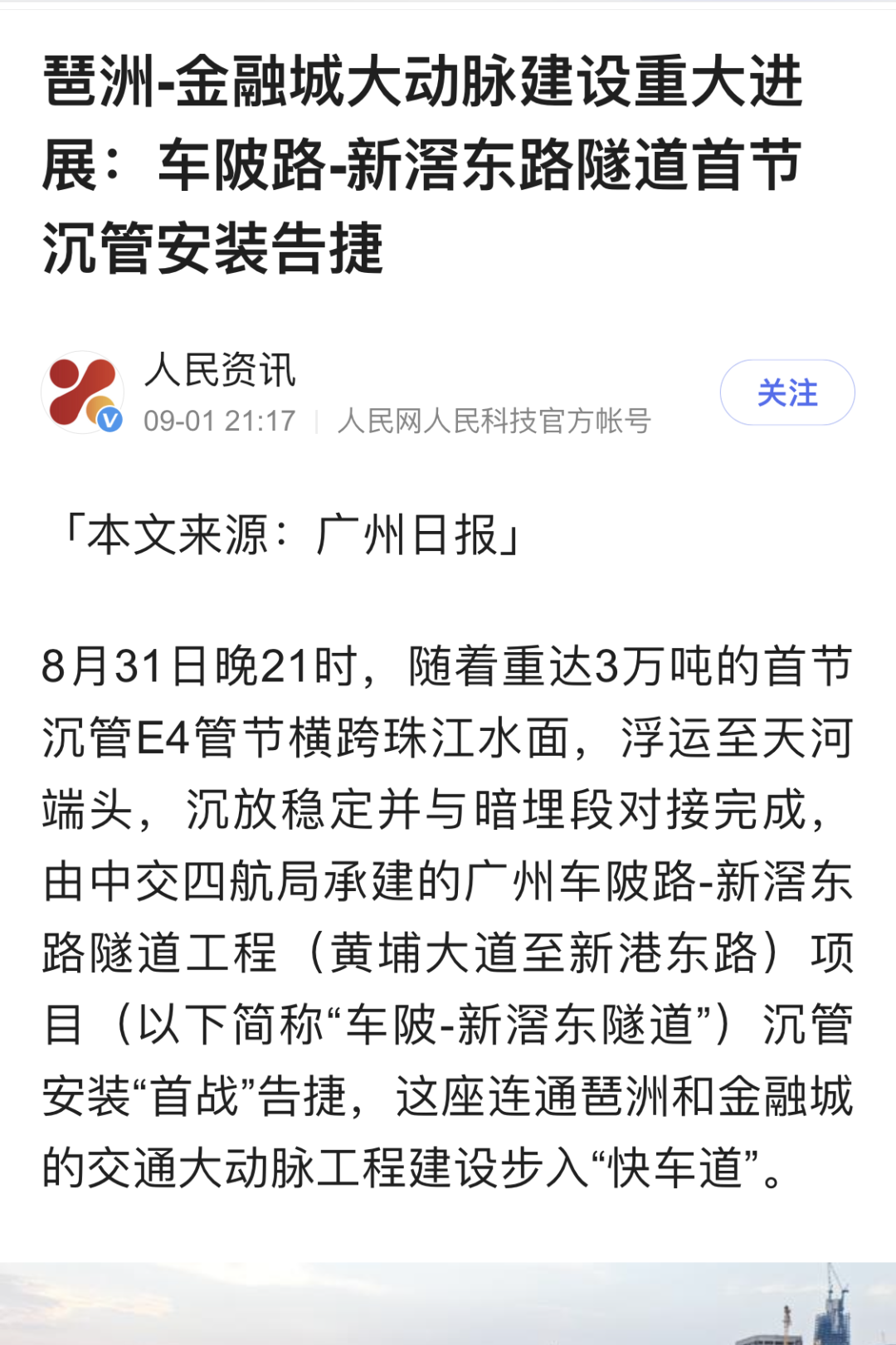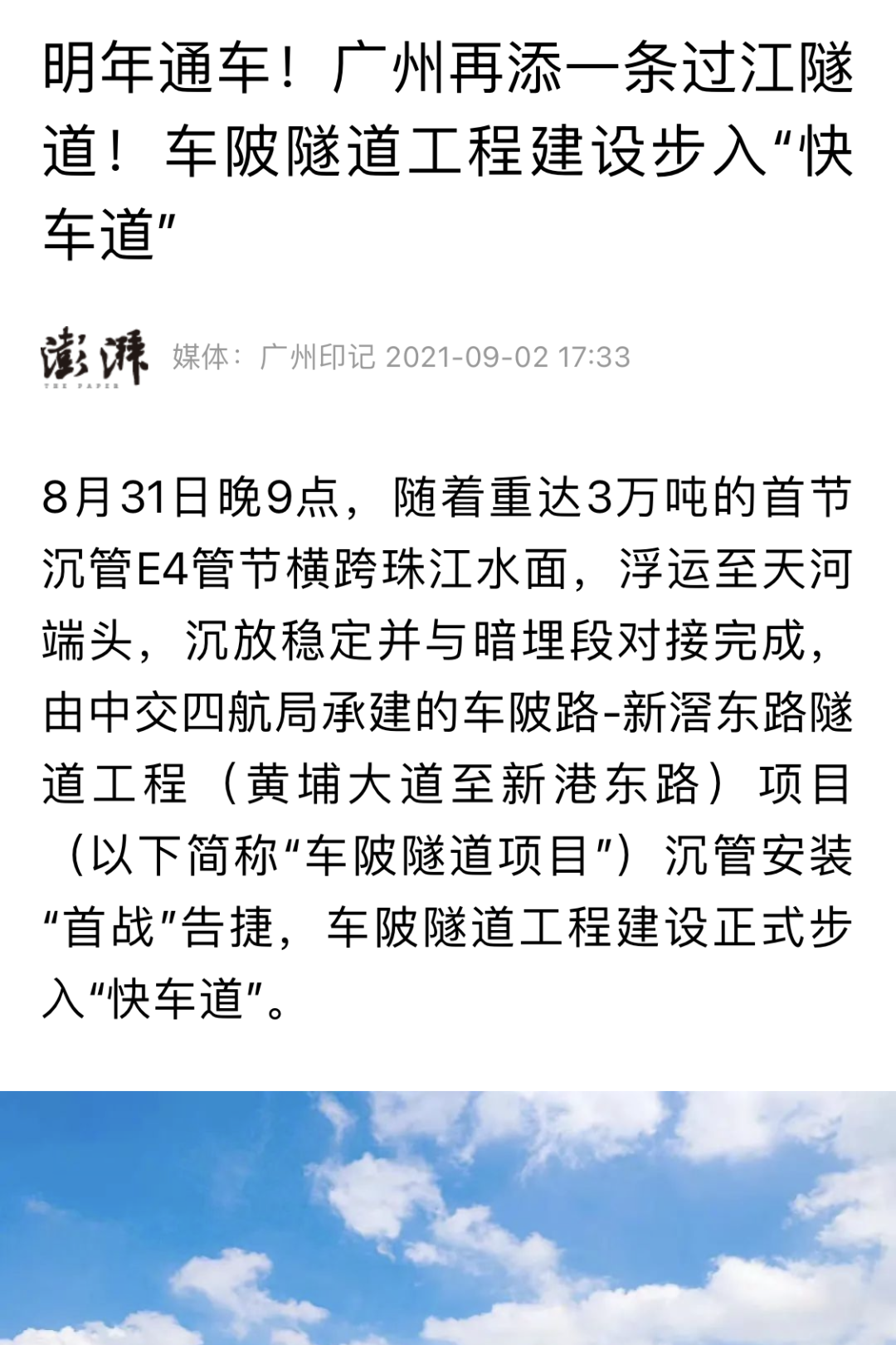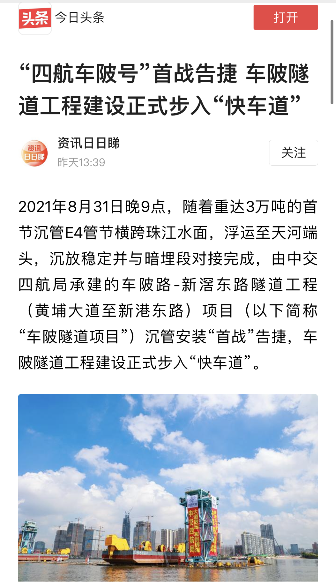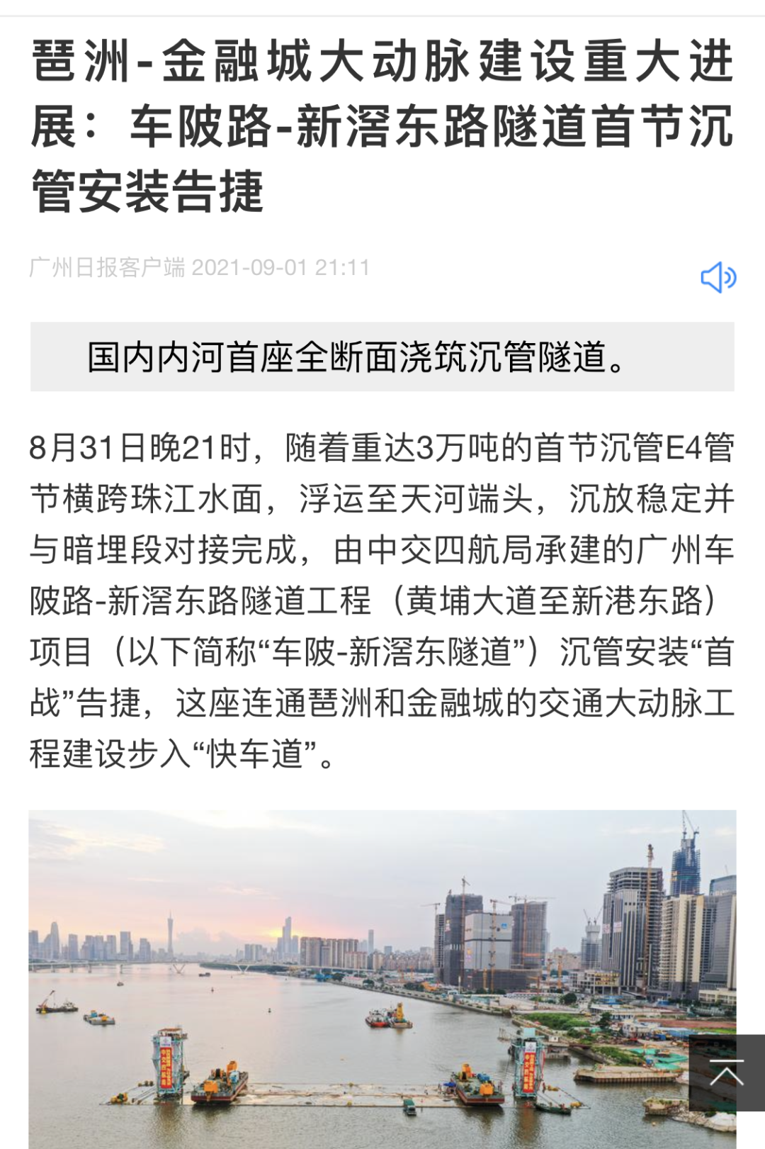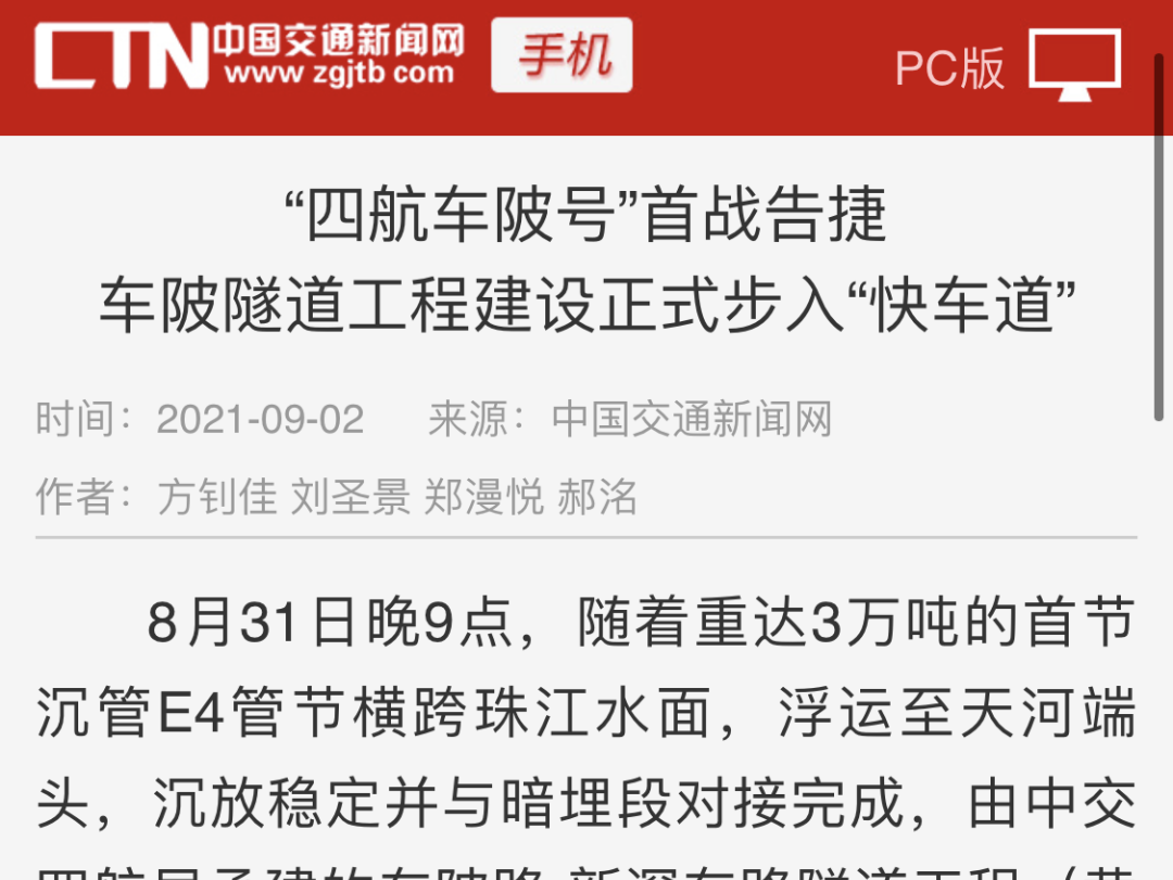 2021年8月31日,车陂隧道项目首节沉管E4管节安装成功,标志着项目工程建设进入加速阶段。人民网、新华网、中国新闻网、南方日报等近60家媒体对此进行了关注报道,项目建设受到各界好评。