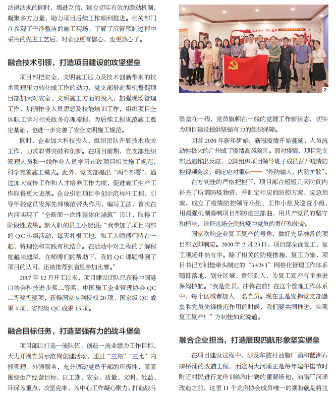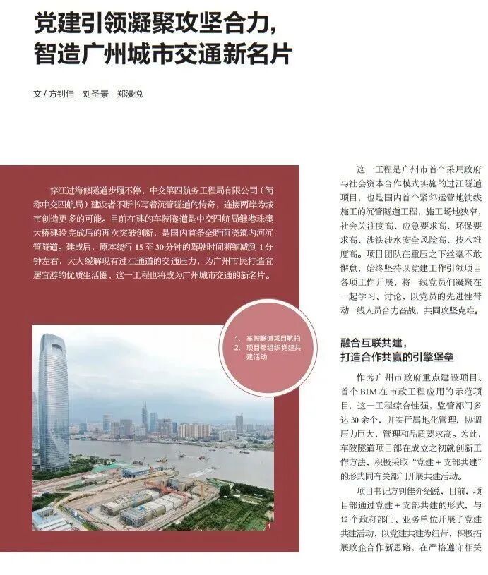 2021年第21期《建筑》杂志聚焦中交四航局车陂隧道项目党支部,以“党建引领凝聚攻坚合力,智造广州城市交通新名片”为题,刊载了项目党支部充分发挥战斗堡垒和党员先锋模范作用,带动项目一线施工生产的故事。《建筑》杂志是国家一级期刊,其“党建风采”栏目聚焦建筑产业党建标杆,深入挖掘优秀党组织创建,为行业党建提供借鉴样板。