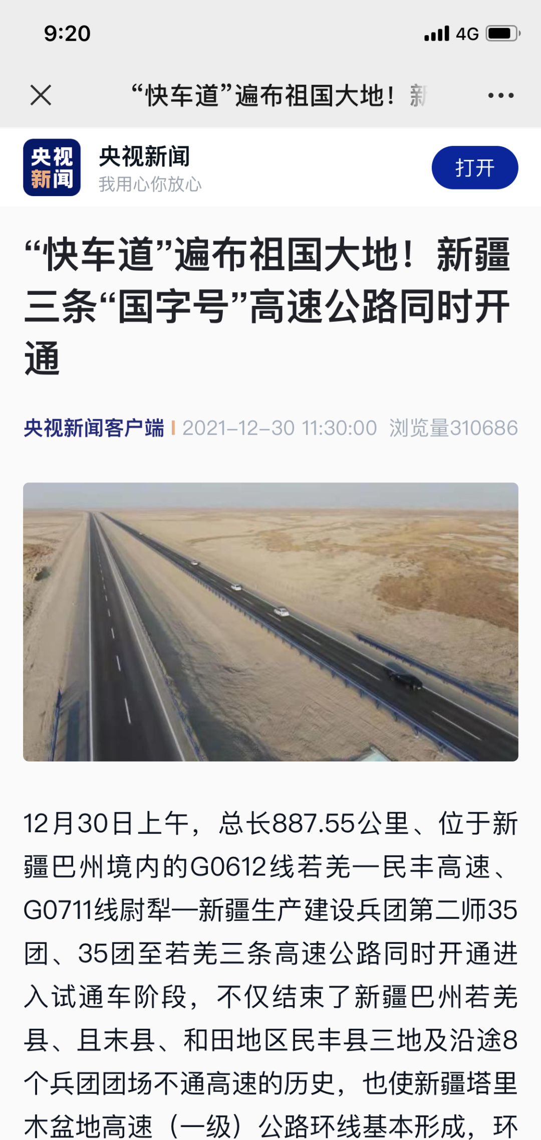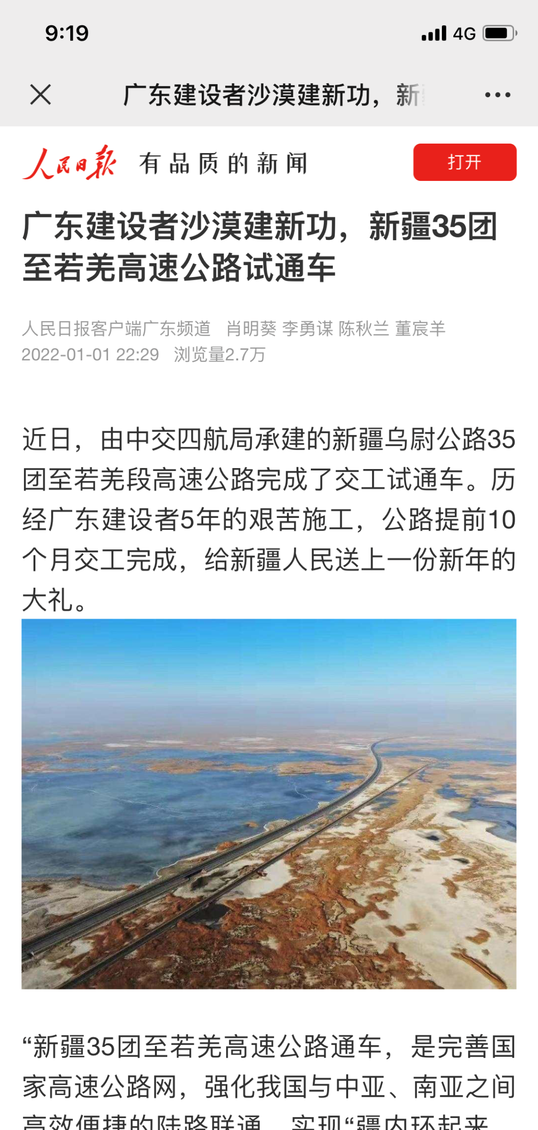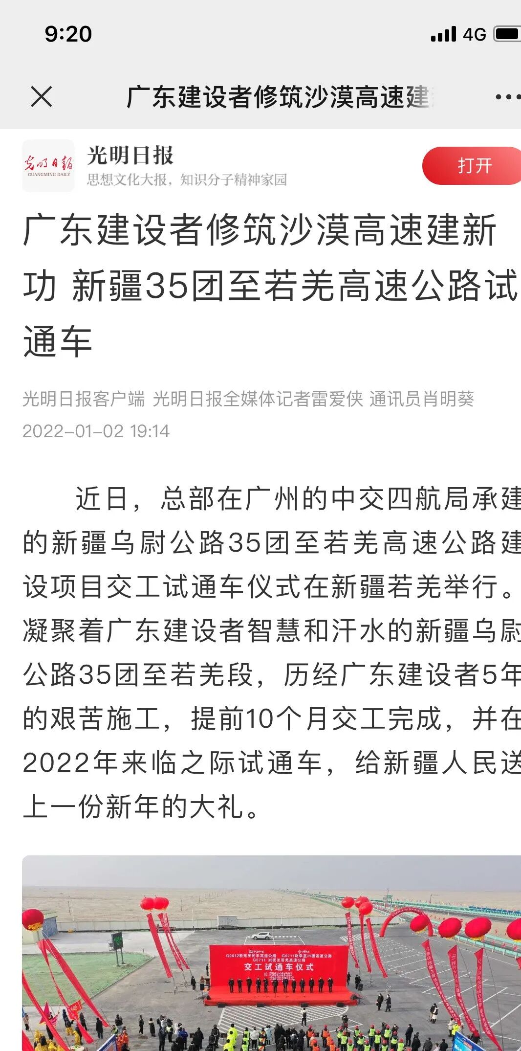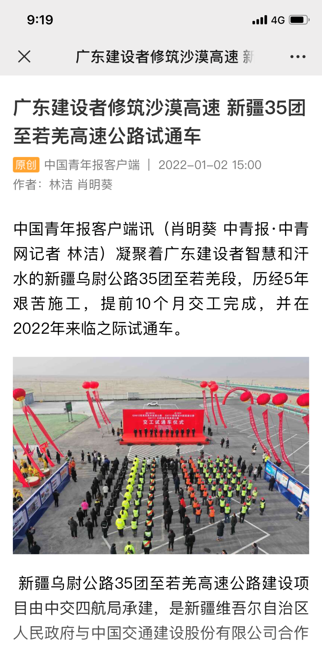 2021年12月30日,中交四航局承建的新疆乌尉公路35团至若羌高速公路建设项目交工试通车!项目建设成果接连登上央视《新闻联播》和《新闻30分》;人民日报、央视新闻频道、光明日报、中国青年报等20多家中央、地方主流媒体和社会媒体对此进行了关注报道。